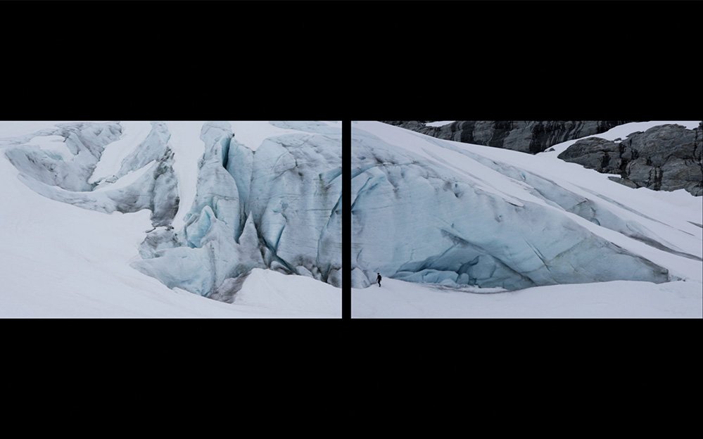(Act 4): Demarcation unfolds directly at the base of, and sometimes beneath, an unstable glacial face in Norway named Haugabreen. Capone’s movement across the base of the glacier demarcates a line between the monumental natural feature and humankind’s presence, the root cause of the glacier’s rapid decline. Capone draws on art historical traditions of the sublime to highlight contemporary and urgent environmental concerns.
