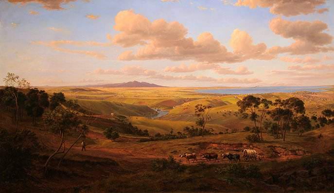 The Gallery is home to a number of iconic Australian paintings including Eugène von Guérard’s Aborigines met on the road to the diggings (1854), The Weatherboard Falls (1863) and View of Geelong (1856), Louis Buvelot’s On the Woods Point Road (1872), Frederick McCubbin’s A bush burial (1890) and Russell Drysdale’s Hill End (1948).