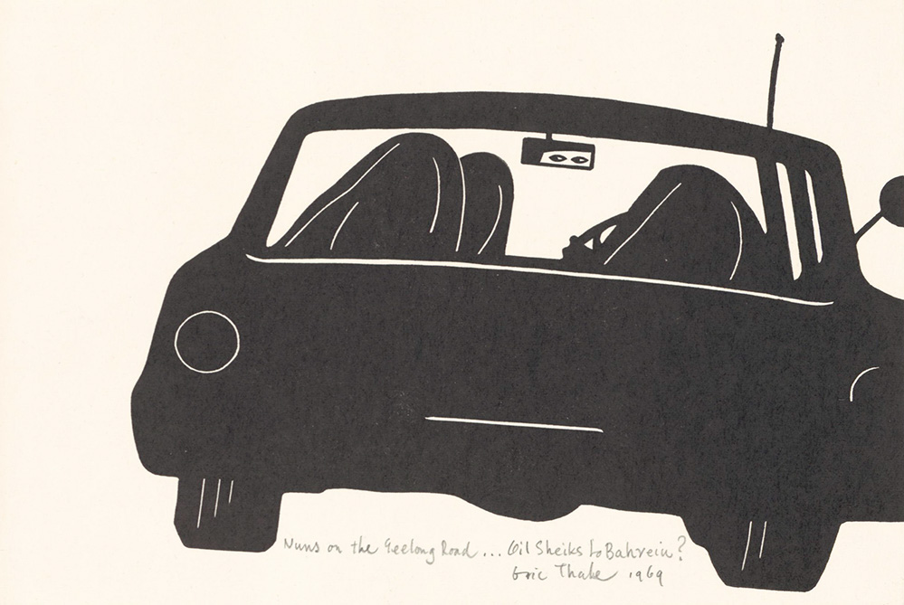 Image: Eric Thake, Nuns on the Geelong Road...oil sheiks to Bahrein? 1969, linocut, Geelong Gallery, Purchased 1976, © Estate of Eric Thake