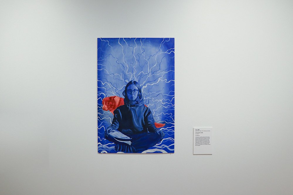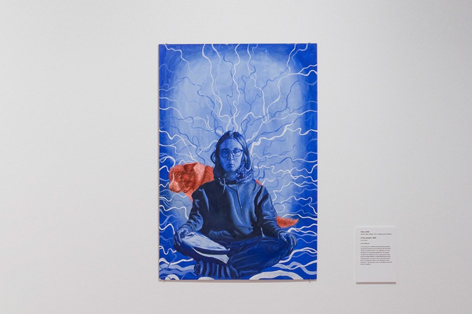 In the present is a reflective self-portrait that explores my personal emotions around the flow and movement of time. By painting myself, I am reflecting on my own perception of my physical appearance. The artwork conveys what it feels like to be a young person today, and the constant feeling of underachievement as time is slipping away. The work is about overcoming these fears, by facing time head-on and allowing it to flow around me. The dog peers over my shoulder as we both face time together.