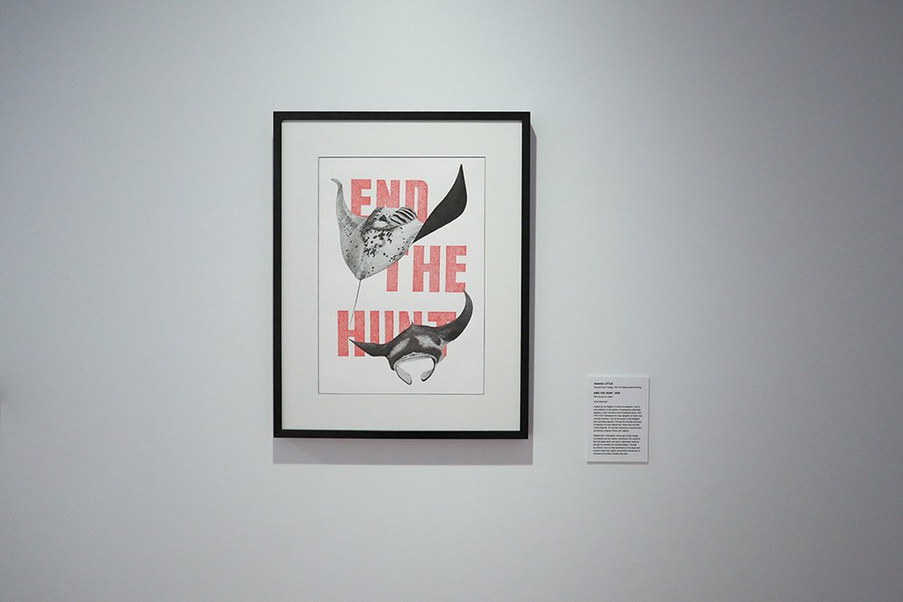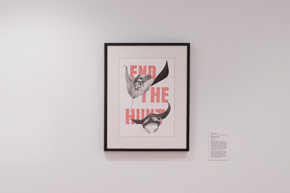 Inspired by the fragility of marine ecosystems, I aim to draw attention to the beauty of endangered underwater species in stark contrast to their threatened future. END THE HUNT addresses the mass slaughter of manta rays (mobula birostris)—one of the ocean’s most intelligent and captivating species. Through the intricate technique of stippling, the work depicts two manta rays and their unique features. The red text introduces a visual tension symbolising violence, blood, and urgency.