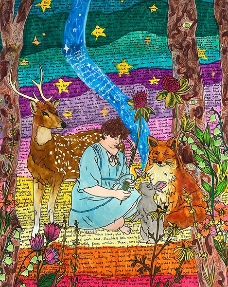 My work relates to my identity as a 24-year-old queer, non-binary artist, my personal growth, and the quiet magic of everyday life. Dream in colours is inspired by the animals I feel connected to: the bunny, the fox, and the deer. The work explores how they remind me to carry gentleness, curiosity, and wisdom in my heart, and together they guide me toward who I am becoming. The handwritten stories in the background of the composition reflect my inner world and the voices that inspire me to continue creating. This piece is for the dreamers, soft hearts, and for anyone finding their way back to themselves.