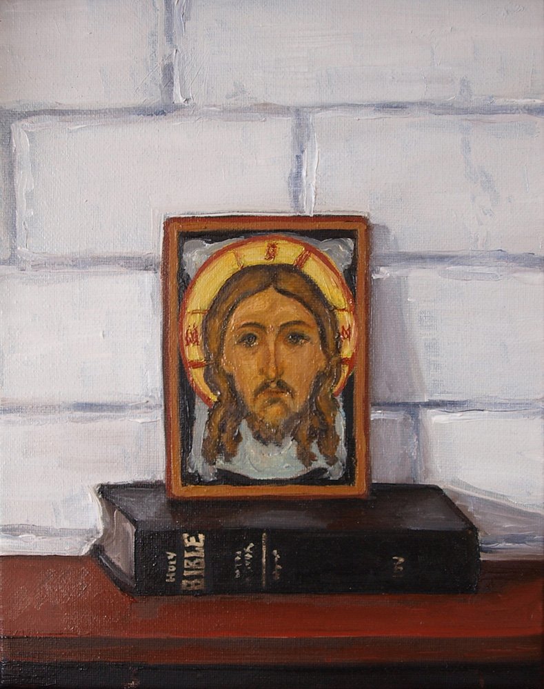 My still life composition centres around a revered icon of Christ and a Bible: symbols of the divine presence and spiritual wisdom found in the Orthodox Church. The juxtaposition of these sacred objects with the quiet simplicity of the studio-painted still life composition creates a reflective space, inviting the viewer to contemplate the eternal within the everyday. My work is inspired by the quote, ‘without Me you can do nothing’ (John 15:5).