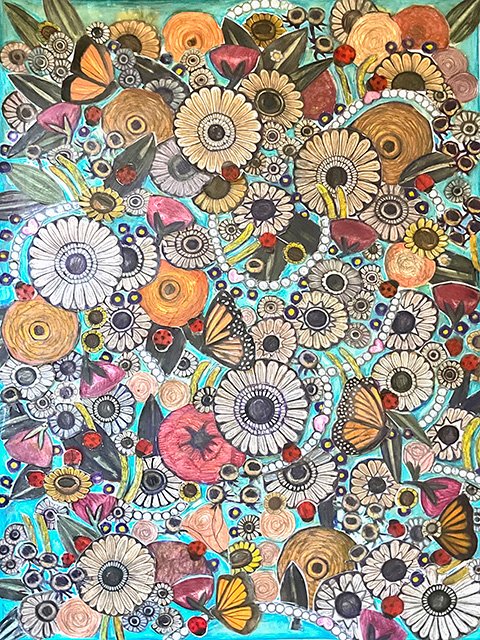 I have been working on Floral confetti slowly over the past year, and it has been my favourite thing to continue adding to in my free time. I love flowers and think they are one of the most beautiful of God’s creations. I wanted to create an artwork that was a celebration of flowers; capturing their unique shapes and textures in my own abstract interpretation, while making use of bright, vibrant colours and detailed line work. I wanted to create a whimsical and garden-like feel by using many colours and a diverse array of flowers, with butterflies and ladybugs woven through them.